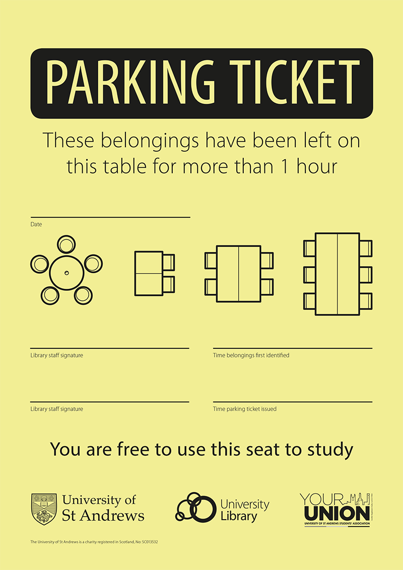 You regularly tell us that we need to do something about people reserving seats in the Library, for example that “Seat-hogging has to stop!“, explaining your frustration, asking us to prevent students ‘reserving’ study spaces and to clarify our view on this practice. We’ve listened and after consultation with the Students’ Association, SRC Education Committee and Student Library User Group, from Monday 26th October we will be placing tickets on desks left with belongings for more than one hour. Here is an example of the yellow parking tickets to look out for: